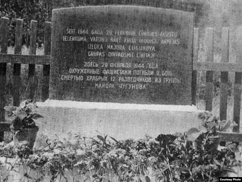 A memorial stone marking the place where 12 Soviet partisans were killed by Nazis in the Latvian village of Malye Baty on February 29, 1944.