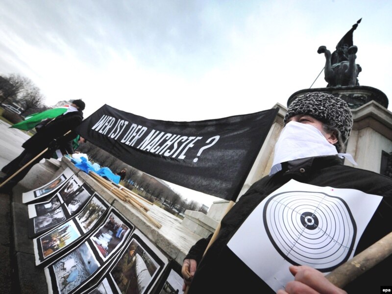 Protesters in Vienna hold photos of the dead and a banner asking "Who's next?" after the death there of Chechen Umar Israilov.