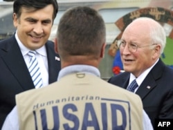 Georgian President Mikheil Saakashvili (left) and U.S. Vice President Dick Cheney speak to a USAID employee delivering humanitarian assistance in Tbilisi.