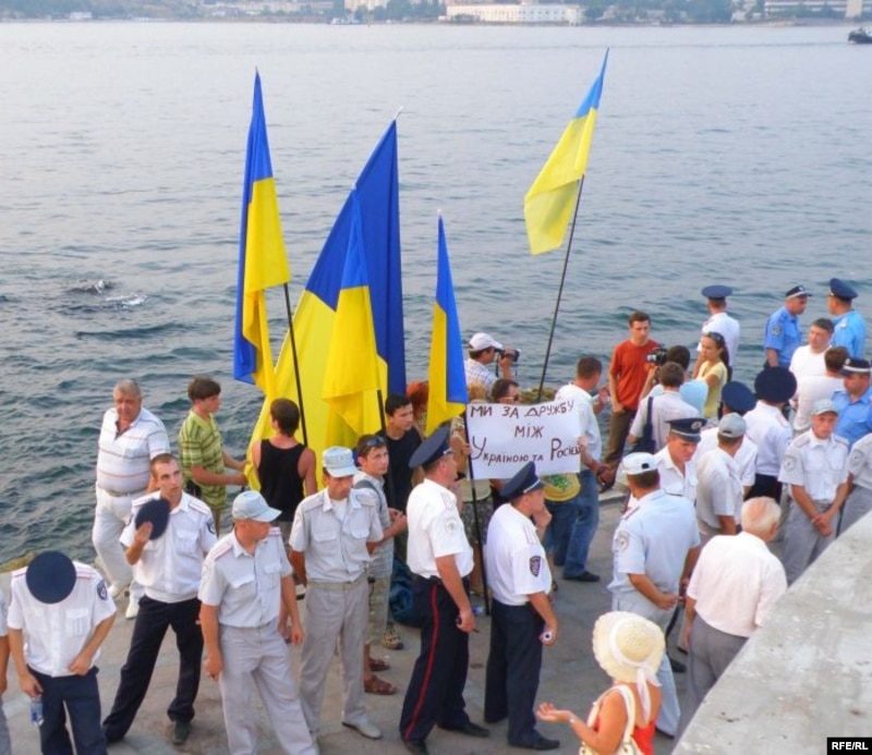 The Ukrainian Navy, with its one serviceable battleship, is also headquartered in Sevastopol. Sailors in Ukrainian uniforms are often insulted or attacked. Last month, a crowd of people led by Russian political activists, including Tyunin, attacked Ukrainian sailors at a ceremony to unveil a plaque marking the date in 1918 when the Ukrainian flag was hoisted aboard ships of the old imperial navy. Police stood by without trying to restrain the attackers.