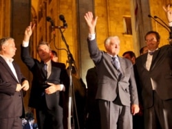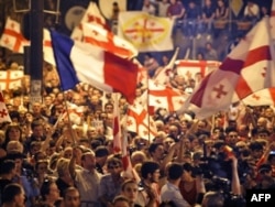 Saakashvili appeared buoyed by that solidarity as he appeared before the crowd of tens of thousands waving Georgian flags and holding icons -- the twin symbols of Georgia's nationhood. And he welcomed the support of four presidents and one prime minister from former communist states who flew in to stand beside him.