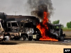 Trucks carrying fuel for NATO forces in Afghanistan burn following an attack by militants in Pakistan.