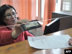 A police clerk issues a new biometric passport to a Bosnian citizen at a police station in Sarajevo.