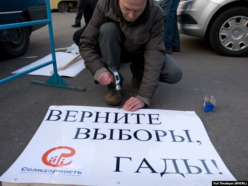 A man with a banner reading "Give back the elections, bastards " at a protest against corruption in Moscow government ahead of the elections.