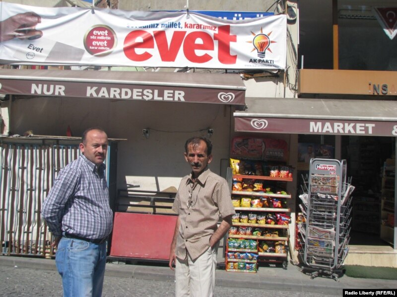 Shopkeeper Yusuf Nur (left) and projection director Soner Ozmen say they'll vote "yes" on September 12.