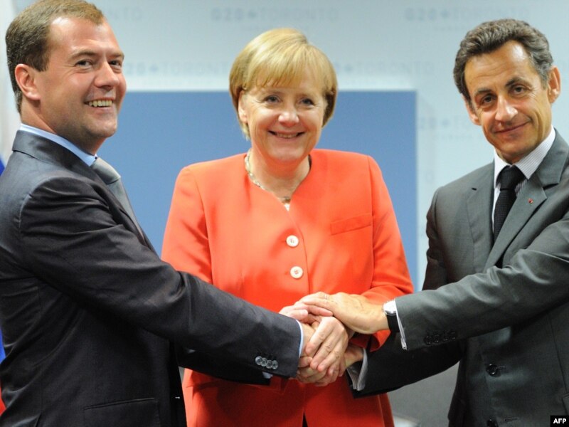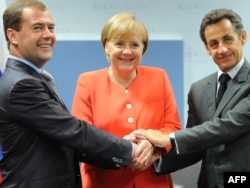 French President Nicolas Sarkozy (right), his Russian counterpart, Dmitry Medvedev (left), and German Chancellor Angela Merkel during a trilateral meeting at the G20 summit