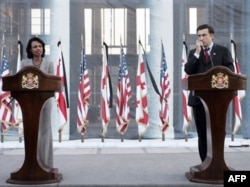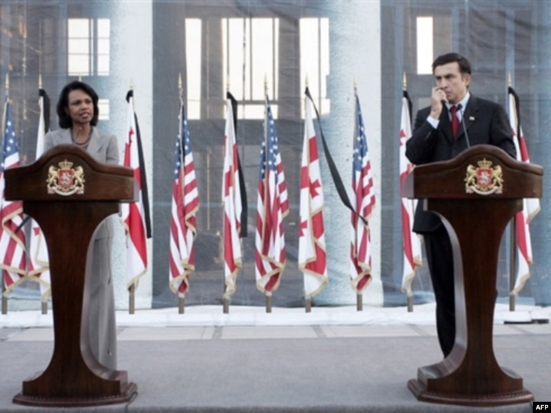 Then-U.S. Secretary of State Condoleezza Rice with Georgian President Mikheil Saakashvili in Tbilisi in mid-August 2008, just a week after the Russia-Georgia war broke out.