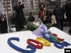Flowers were left on the Google signboard by Chinese supporters at its headquarters in Beijing on March 23.