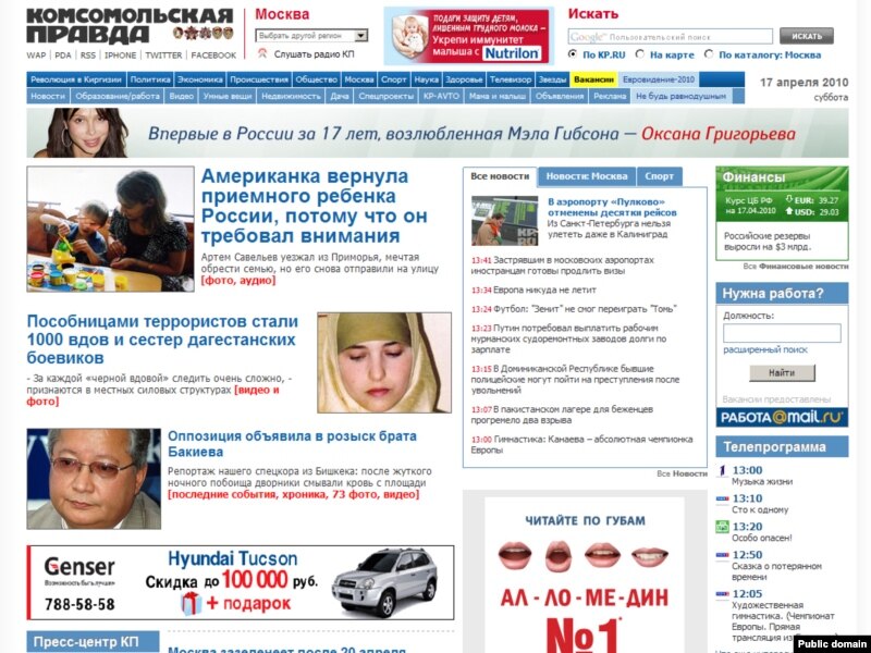 A screen grab of the "Komsomolskaya pravda" website of April 9, whose second headline asserts that "1,000 Wives And Sisters Of Daghestani Fighters Become Terrorist Accomplices." (Click to enlarge)