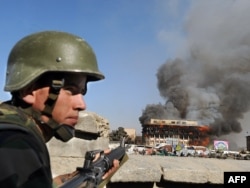 An Afghan National Army soldier keeps watch as smoke billows from a building after clashes between Taliban-linked militants and security forces in Kabul today.