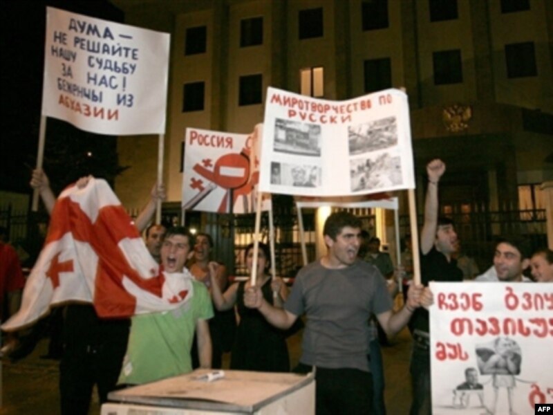 About 200 people gathered at the embassy on the night of August 26 to protest Russian President Dmitry Medvedev's announcement earlier in the day that Moscow would recognize Abkhazia and South Ossetia as independent states.