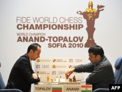 Current world champion Viswanathan Anand of India (right) plays against his Bulgarian challenger Veselin Topalov in the final in April.