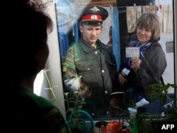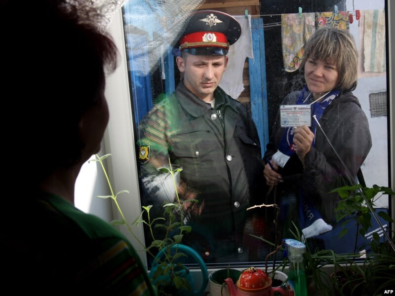 A census taker -- accompanied by a police officer -- shows her ID to a woman during the first day of Russia's nationwide census in the southern city of Kemerovo.