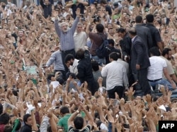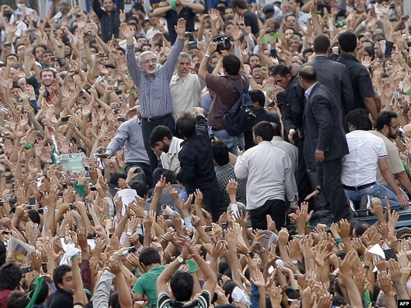 Reformist candidate Mir Hossein Musavi (center) addresses tens of thousands of supporters on the streets of Tehran on June 15.