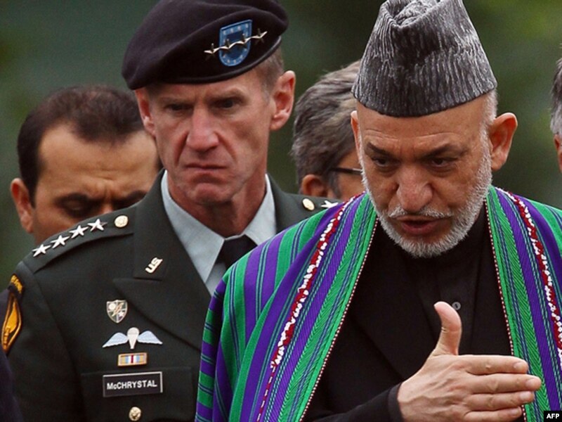 General Stanley McChrystal (left) and Afghan President Hamid Karzai visit Arlington National Cemetery in Virginia on May 13.