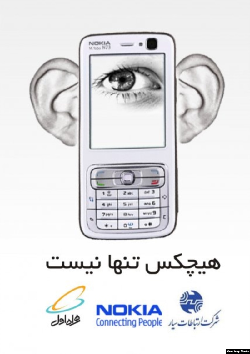A blog titled "Boycott Nokia For Iran Crackdown" has changed Nokia's motto from "connecting people" to "jailing people." It states that Nokia has a responsibility to ensure that its technology is used in an ethical manner. On Facebook, an image is circulating showing a Nokia cell phone with ears, above text that reads: "Nobody is alone."