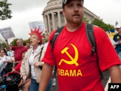 A demonstrator wears a T-shirt with the communist hammer and sickle during a Tea Party march in Washington last month.