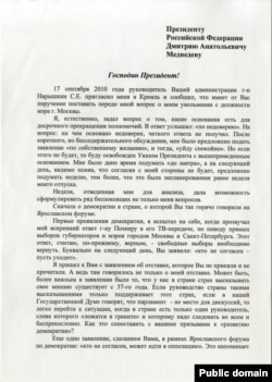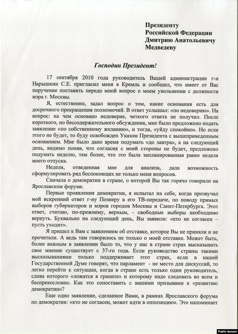 Although the letter was written on September 26, Kremlin spokeswoman Natalya Timakova insisted its content had not influenced Medvedev's decision to sack the mayor.
