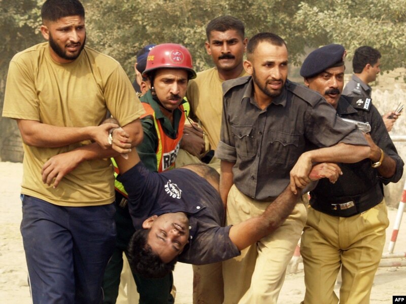 Policemen remove an injured colleague from a police training center after an attack in Lahore last month.