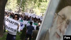 Fars says protesters were holding banners with slogans against the United States and against nuclear weapons, including: "U.S. is the only nuclear criminal in the world," "Nuclear energy for all, Nuclear weapons for no one," "Obama's threats are a sign of our power," and "Obama, Ebadi, congratulations on your union".