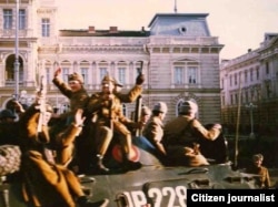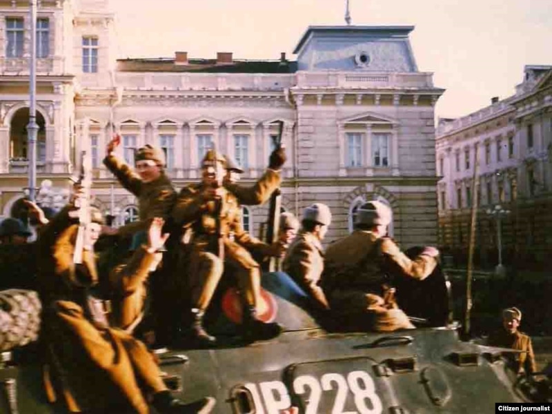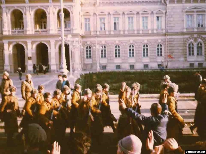 Romanian Army "standing down" outside Arad City Hall and returning to barracks on December 22. (photo by Florin Muresan)