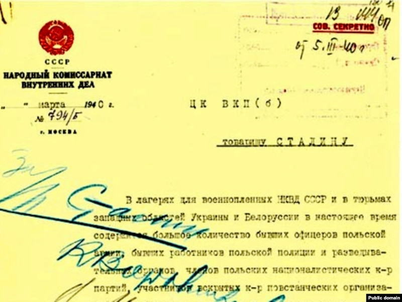 "The main documents that expose the fundamental role of Stalin and the Politburo in this war crime were published in 1992 -- at the time when [then-Russian President Boris] Yeltsin gave them over to Poland -- and since then they have not been a secret," Rachinsky says.