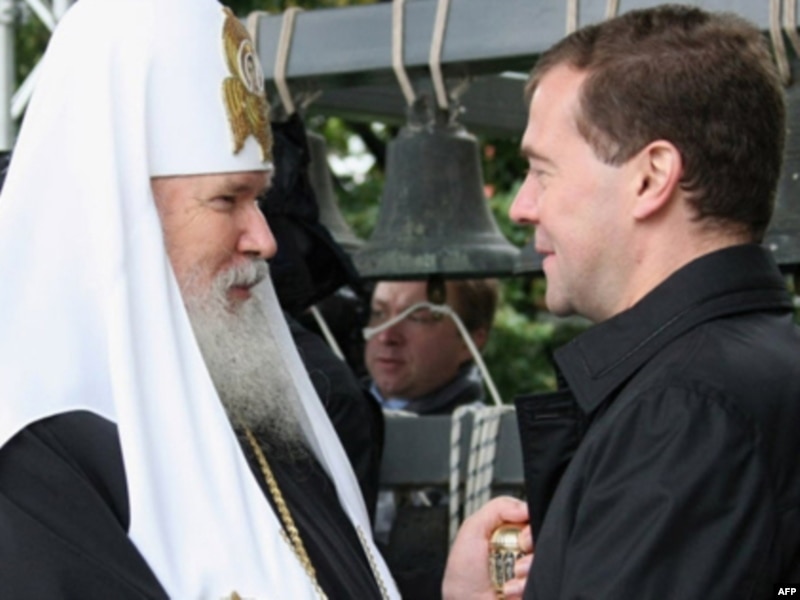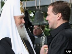Russian President Dmitry Medvedev speaks with Aleksy II at a ceremony in Moscow on September 12.