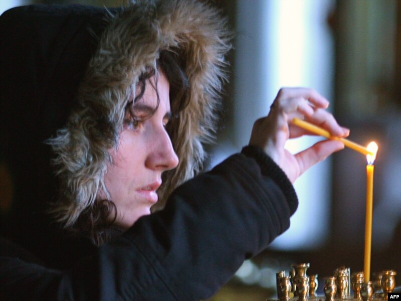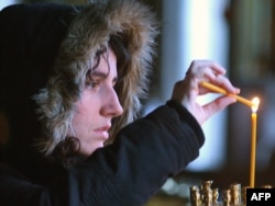 A believer lights a candle to pay last respects to Patriarch Aleksy II in a church in Moscow.