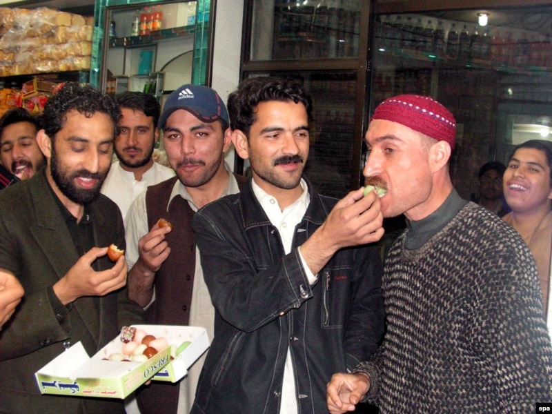 Locals celebrate the signing of Shari'a law in Mingora, Swat Valley.