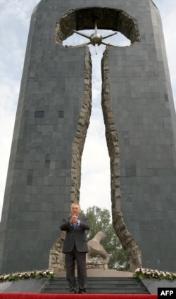 Kazakh President Nursultan Nazarbaev stands in front of a monument to the nuclear tests in Semipalatinsk in June.