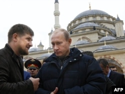 Russian Prime Minister Vladimir Putin (right) speaks with Chechen President Ramzan Kadyrov in Grozny while visiting the newly built Central Dome mosque in October 2008.