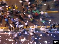 The two peaceful but competing rallies blocked traffic across the city. At one point, supporters of the two camps faced off in the streets, shouting slogans and waving flags but not clashing.