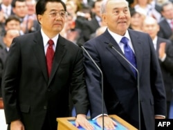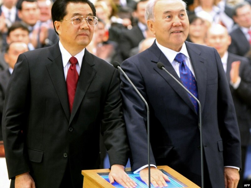Hu (left) and Kazakh President Nursultan Nazarbaev push the symbolic start button at the opening of the Kazakh-China spur of the pipeline in Astana on December 12.