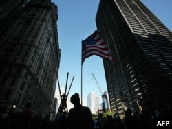 A man holds an American flag outside ceremonies to honor the 9/11 victims at Ground Zero in New York on September 11.