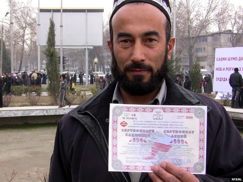 One of the first stockholders in the Roghun hydropower station holds up his stock certificate.