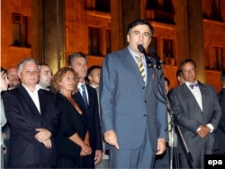 Speaking before tens of thousands of flag-waving Georgians at a nighttime rally on August 12, a defiant and visibly confident President Mikheil Saakashvili vowed defiance in the face of Russia's military might.