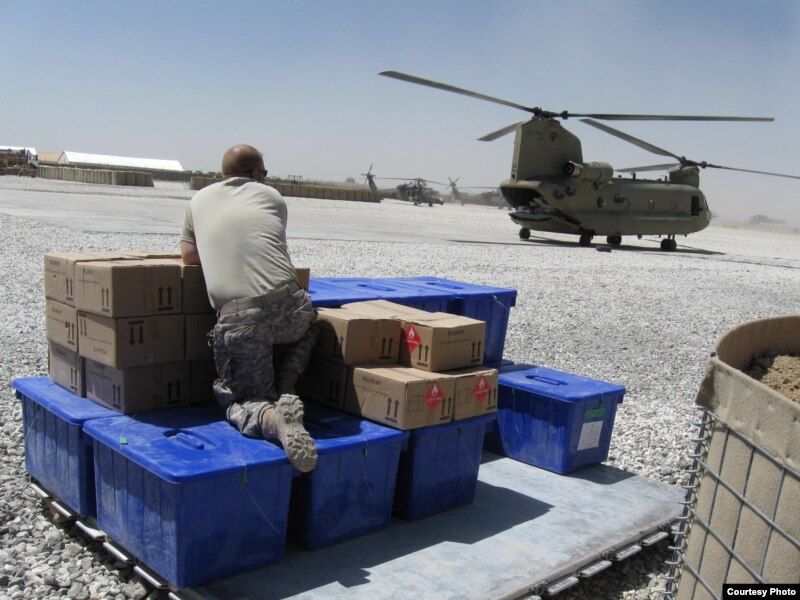 While we couldn’t actually go to the polls, there was a lot of election-related action at the PRT. At the request of the Afghans, the PRT was working almost around the clock preparing the elections in remote and violent parts of the province. Steve and I flew by helicopter to a nearby district, to drop off election workers, cardboard voting booths, ballots, and ballot boxes.