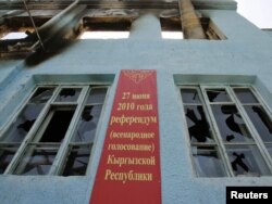A banner that reads "June 27, 2010. Referendum (nationwide voting) of Kyrgyz Republic" hangs on the wall of a ruined local school in Osh.