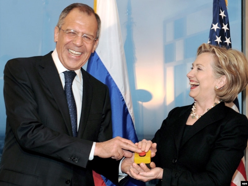 U.S. Secretary of State Hillary Clinton (right) gives a gift of a symbolic "reset" button to her Russian counterpart, Sergei Lavrov.