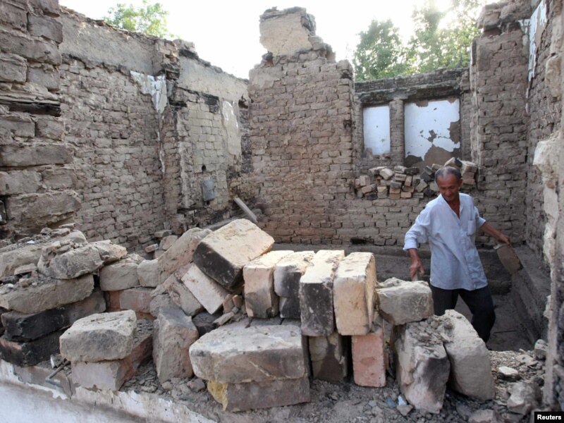 An ethnic Uzbek man inspects the ruins of his house, destroyed during the clashes in June, in the city of Osh.