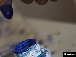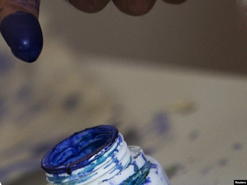 A man dips his finger into ink before voting at a polling station during parliamentary elections in Kabul on September 18, 2010.