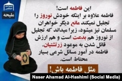 "This is Fatima," reads the text. "Not only does Fatima not celebrate Norouz, but she also prevents other Muslim sisters [from doing so.] Because she knows that celebrating Norouz is an invention that promotes Zoroastrian traditions. Fatima is very cautious in matters of religious affairs."