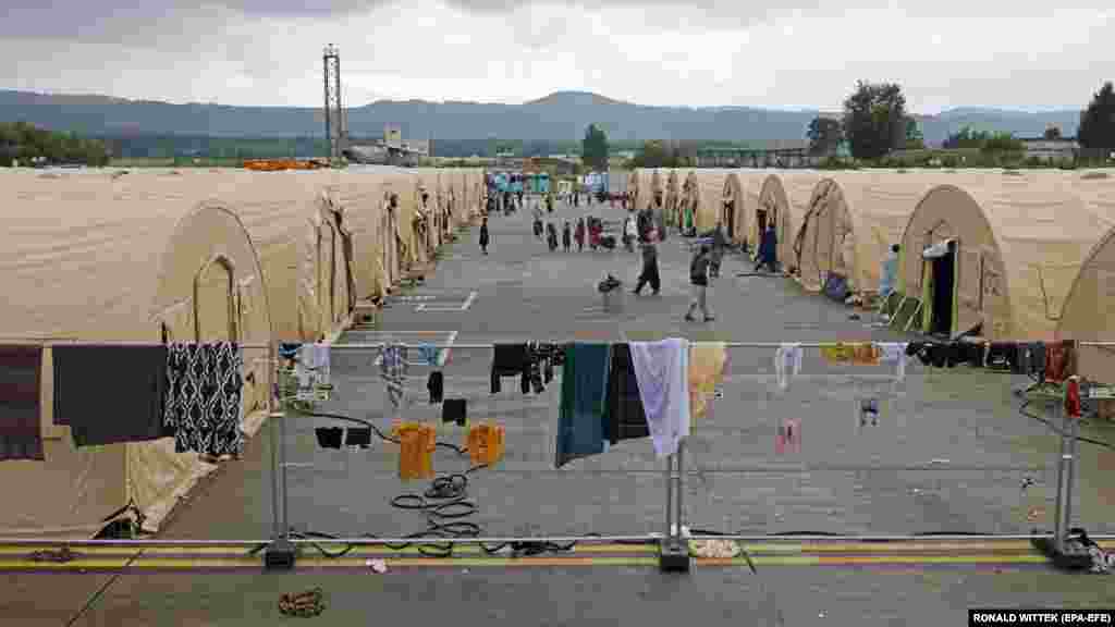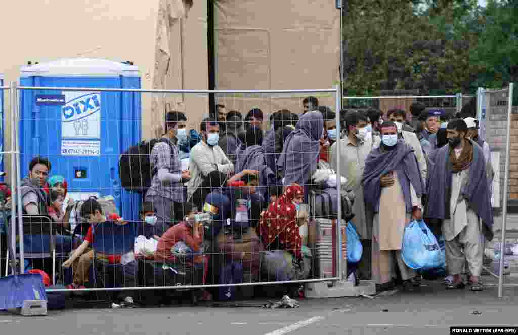 Evacuees from Afghanistan are seen at the U.S. air base in Ramstein, Germany, on August 30. Ramstein Air Base became a major hub during the operation to evacuate people from Afghanistan. As part of Operation Allies Refuge, evacuees received temporary lodging, food, water, and access to medical care while preparing for travel to their final destinations.
