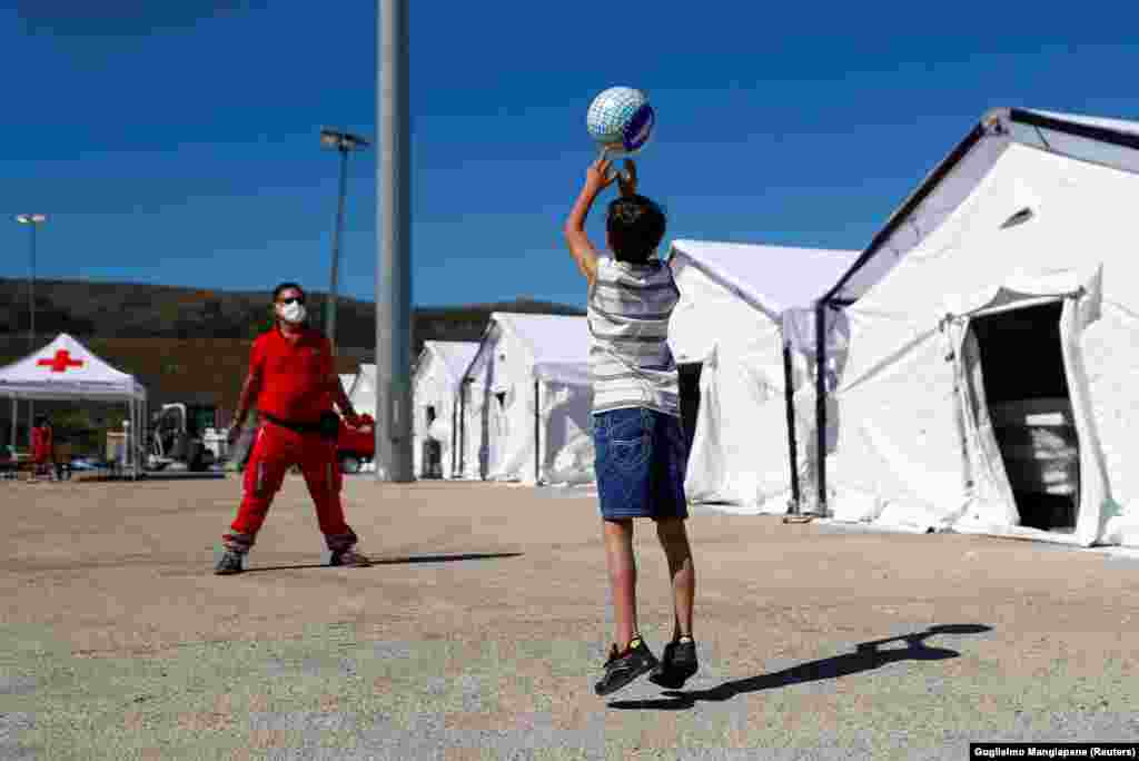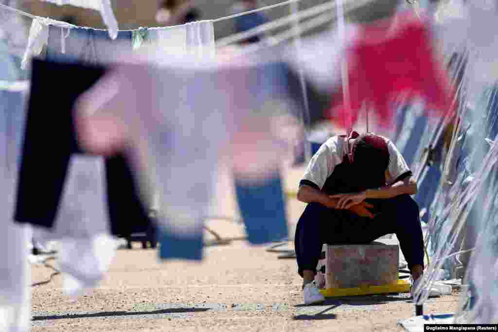 An Afghan evacuee stands at a holding center run by the Italian Red Cross in Avezzano, Italy, on August 30. After their travels, the evacuees there are waiting out their quarantine for COVID-19.