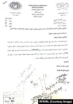 A source within the ministry has provided RFE/RL's Radio Azadi with a letter detailing orders for all employees to be given a test to gauge their knowledge of Islam. The letter, which bore Taliban stamps and insignias and was signed by officials, was delivered by the ministry's Directorate of Invitation and Guidance.