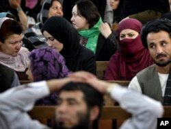 Defeated candidates from the September 2010 parliamentary election wait for the resumption of proceedings of a special electoral tribunal in a Kabul courtroom on June 23.