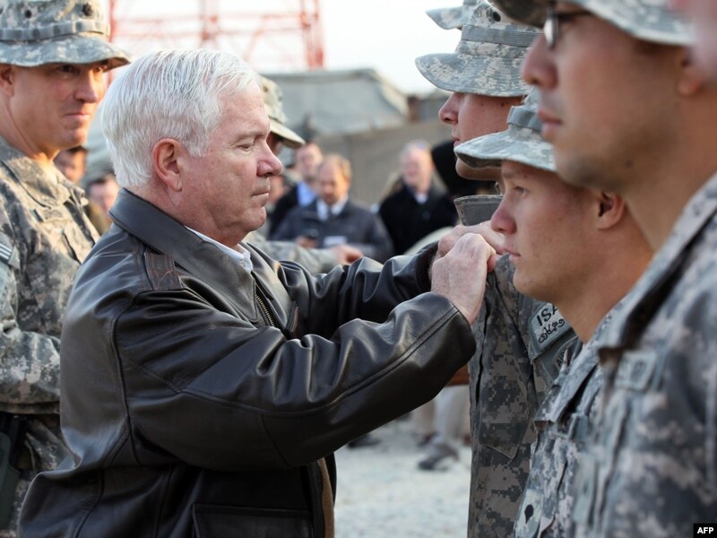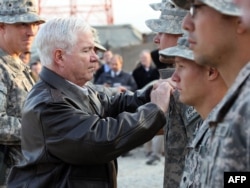 U.S. Secretary of Defense Robert Gates decorates soldiers at Forward Operating Base Connolly in Kunar Province on December 7.
