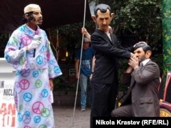 The protest's highlight was a mock wedding ceremony between Ahmadinejad and his Syrian counterpart, Bashar al-Assad, who is currently leading a brutal crackdown on his own people. Libya's ousted leader Muammar Qaddafi officiated.