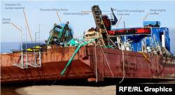 The floating platforms, or pontoons, meanwhile, provide more clues as to what happened, but leave more questions unanswered. The two platforms, which contained partially destroyed industrial equipment, have remained on the shore unguarded and without any explanation from authorities.
