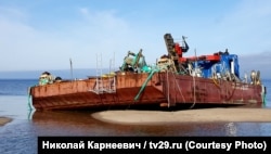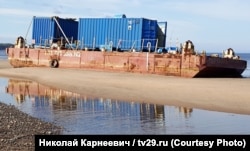 Geiger-counter readings taken by a reporter for TV29.ru, meanwhile, showed moderate to high levels of radiation emanating from a tow rope that was attached to one of the floating platforms. Another reading closer to the other platform also showed radiation levels in excess of normal background levels.